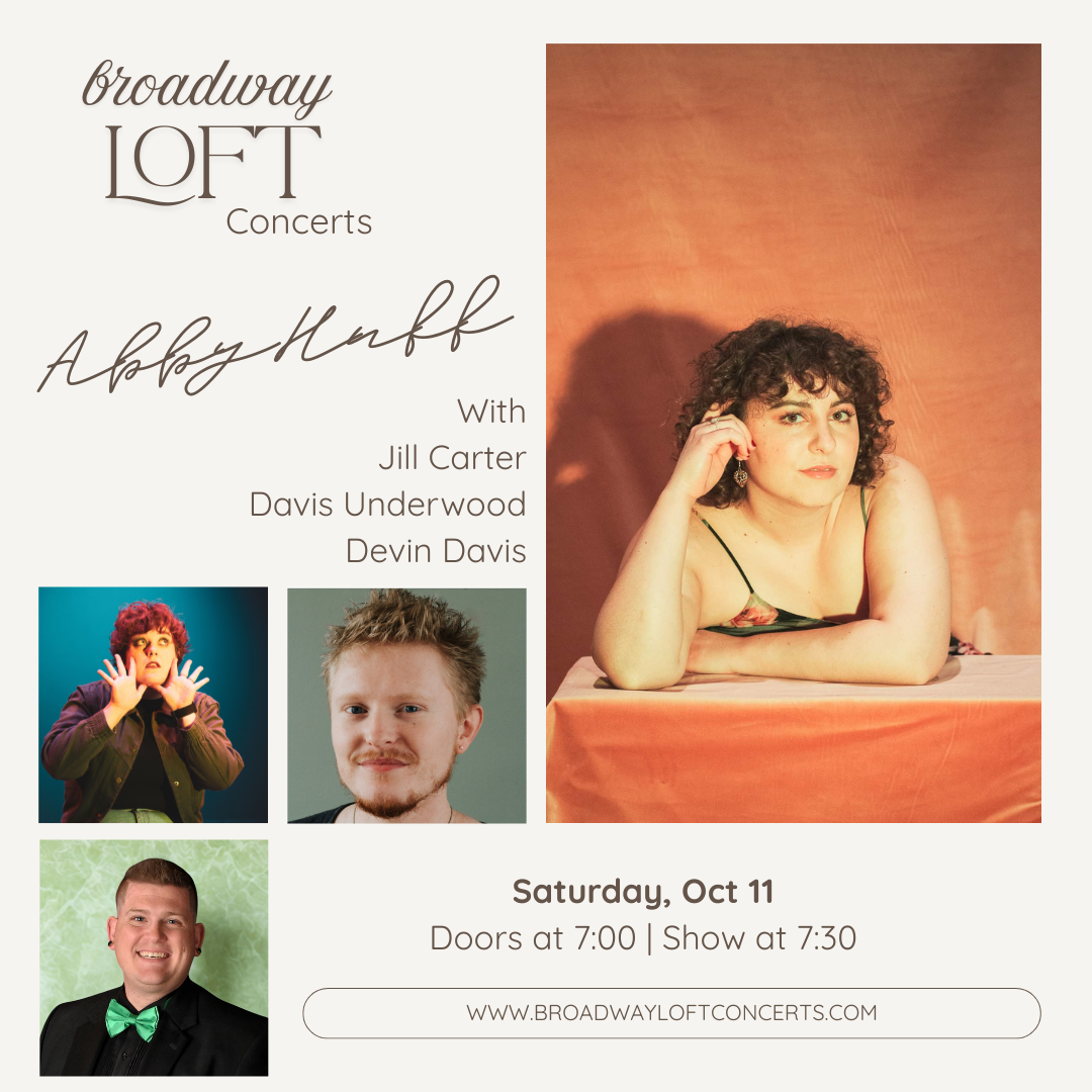 Step into an evening of charm, storytelling, and song as NYC-based singer, actor, and songwriter Abby Huff takes the Loft stage alongside friends for a special cabaret-style showcase. From beloved Broadway favorites to heartfelt originals, Abby’s radiant voice and theatrical flair promise an unforgettable night of music and connection. Joining her on stage are Jill Carter, Davis Underwood, and Devin Davis for a night of true bliss and artistry!